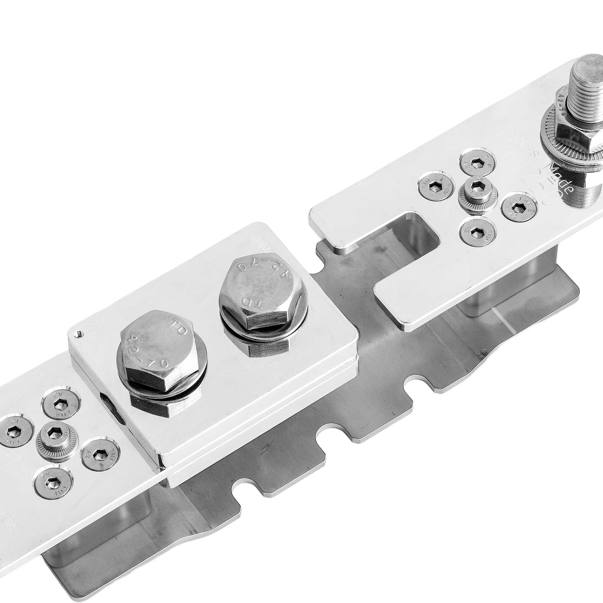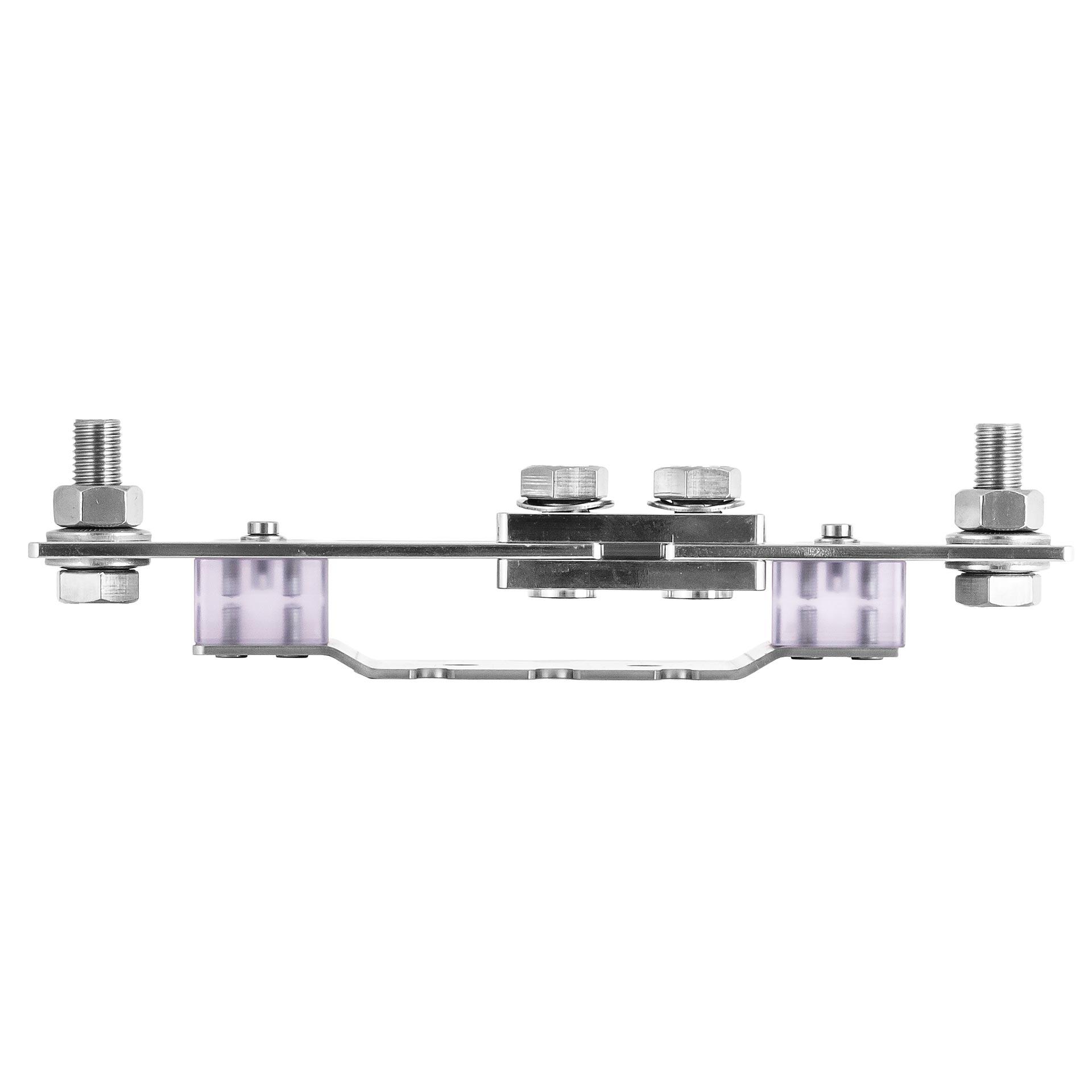 Le sectionneur de neutre NT1250 a été développé dans une version renforcée. Les supports en polycarbonate sont particulièrement résistants à la chaleur et disposent de huit points de fixation, assurant une isolation fiable entre la plaque de base et le support en cuivre.